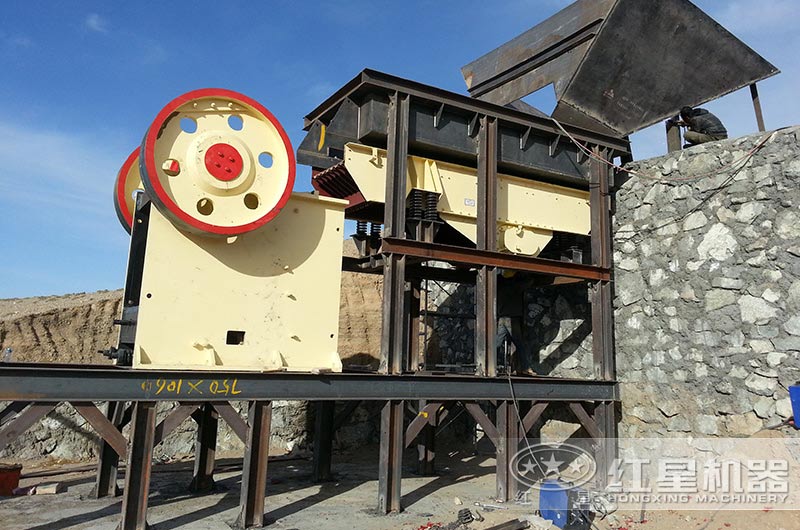 河卵石由给料机均匀地送进粗破机(颚式破碎机)中进行初步破碎,破碎后的物料运往下一阶段;