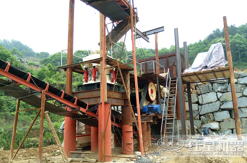 粗碎后的河卵石由输送机送圆锥式破碎机进行进一步破碎,圆锥破碎机采用层压破碎,破碎出是粒形较好;