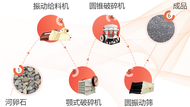 筛分机筛分出的不符合规格的河卵石要重新返回圆锥破碎机中再次破碎机,直到符合成品规格的要求。