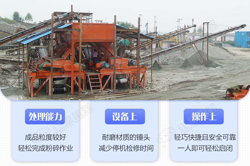 2、从设备耐磨性方面来说,双级破碎机选用的是高合金耐磨材质打造的锤头,一副可顶三副使用,可大大减少停机检修时间。
