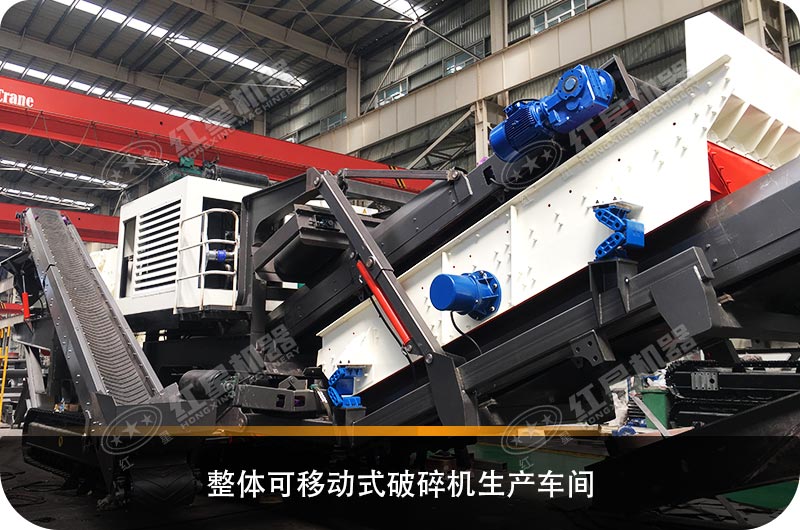 整体可移动式破碎机出厂的时候就已经配置齐全,如给料机、主破碎机、筛分机等设备均可安装到一台移动机架上,也就是说这台机架就是它的基建了。