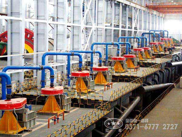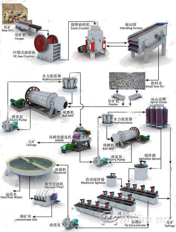 整个赤铁矿选矿生产线采用两段磨矿流程,这样既能有效地提高生产效率,又能减少资源的浪费,节省成本。磨矿第一段选别采用一台磁选机,二段选别采用一台粗选磁选机一台精选磁选机,既能有效地提高生产产量,又能达到有效地达到磨矿细度,另外,磁选过程中添加了脱磁流程,主要作用是脱去矿物自身所带的磁性,提高精矿的品味。经过磁选机分选的赤铁矿物料要被送入浮选机,根据赤铁矿的特性加入相应的药剂,将赤铁矿精矿选别出来,之后将含有大量水分的赤铁矿物料送入浓缩机进行缩水作业,之后经烘干机烘干即为干燥的成品物料。