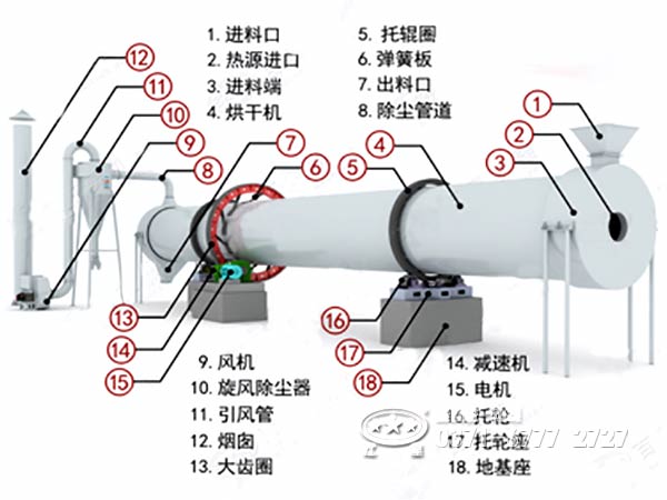 稀土矿烘干机筒体是一个与水平线略成倾斜的旋转圆筒,物料从较高一端加入,载热体由低端进入,与稀土矿物料成逆流接触,也有载热体和物料一起并流进入筒体的,随着圆筒的转动物料受重力作用运行到较底的一端。湿稀土矿在筒体内向前移动过程中,直接或间接得到了载热体的给热,使湿物料与筒内壁接触进行干燥,然后在出料端经皮带机或螺旋输送机送出。整个设备对稀土矿的烘干效果好,烘干能力强,在传热过程中强度大、效率高,干燥成本低。