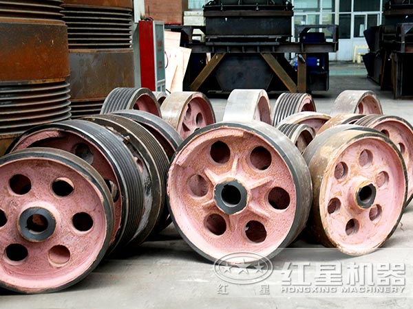 颚破机的飞轮用以存储动颚空行程时的能量,再用于工业形成,使机械的工作符合趋于均匀。带轮也起着飞轮的作用。飞轮常以铸铁或铸钢制造,小型机的飞轮常制成整体式。飞轮制造,安装时要注意静平衡。
